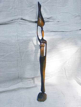 are craft stalls. I see a carving I like; an elongated figure of a woman carrying