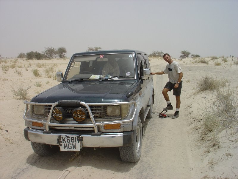 With a few weeks to go he bought a Land Cruiser and paid the RAC an extortionate bond for an any-country temporary-import vehicle pass. In Madrid the car got broken into and he lost a lot of useful gear including a GPS. In Mauritania the cooling system blew up and he needed a new radiator. By the time he got to the east end of Niger three months has passed. Simon has gained considerable experience, but his enthusiasm was beginning to wane. He finds comfort in the tapes and tinned food he’s brought with him; he prefers to camp on the roadside in the middle of nowhere rather than taking his chances running into the wrong type in towns. His achievement is significant. Even more so when I realise he's yet to unwrap his sand-ladders and his wheels are permanently stuck in two-wheel-drive.