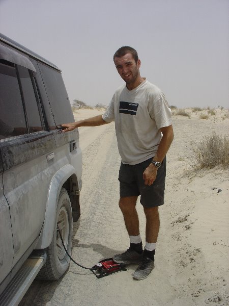 It feels good. Within minutes we're stuck in the Sahara sand. We unpack the